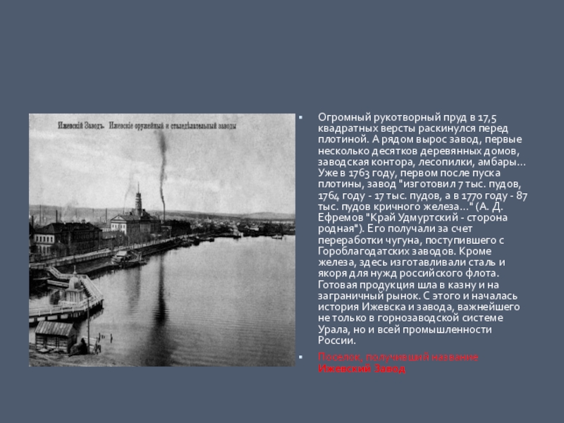 рядом вырос завод, первые несколько десятков деревянных домов, заводская контора, лесопилки, амбары… Уже в 1763 году, первом после пуска плотины, завод "изготовил 7 тыс. пудов, 1764 году - 17 тыс. пудов, а в 1770 году - 87 тыс. пудов кричного железа…" (А. Д. Ефремов "Край Удмуртский - сторона родная"). Его получали за счет переработки чугуна, поступившего с Гороблагодатских заводов. Кроме железа, здесь изготавливали сталь и якоря для нужд российского флота. Готовая продукция шла в казну и на заграничный рынок. С этого и началась история Ижевска и завода, важнейшего не только в горнозаводской системе Урала, но и всей промышленности России.