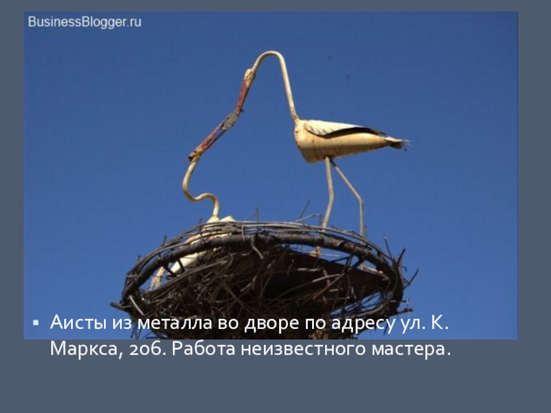 Аисты из металла во дворе по адресу ул. К. Маркса, 206.