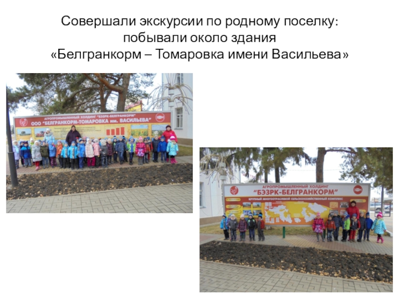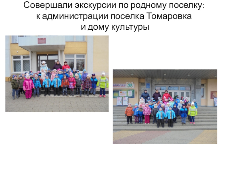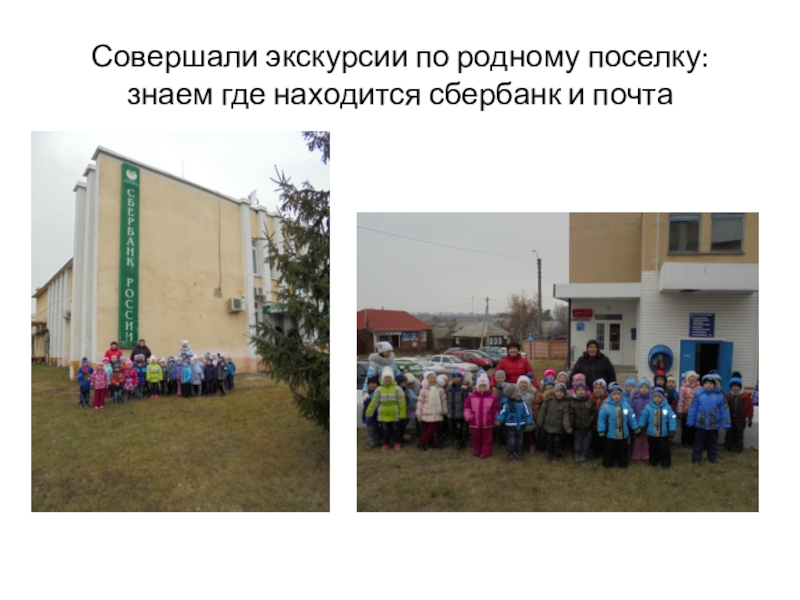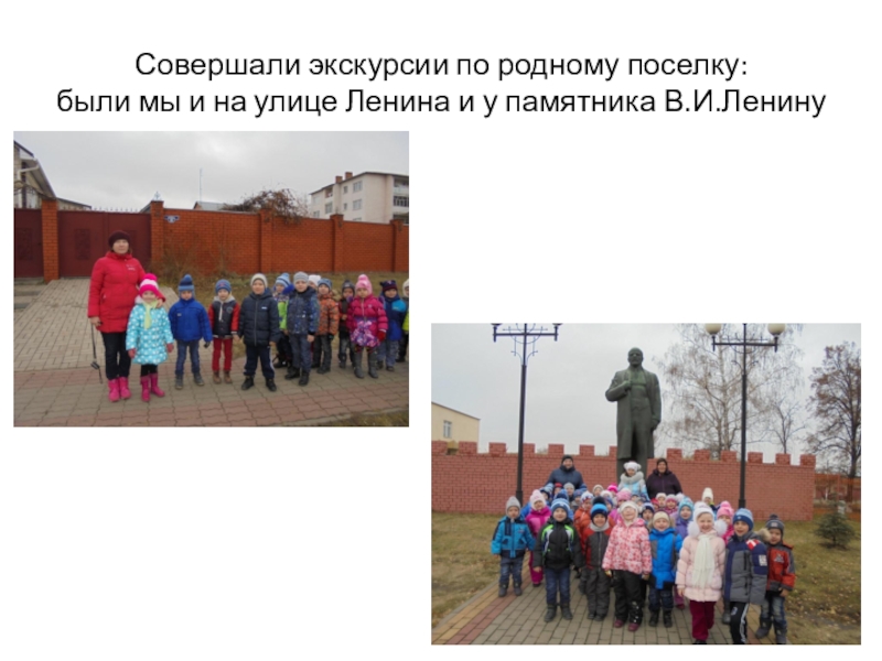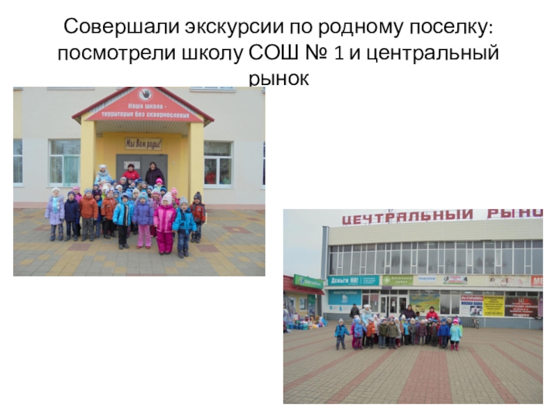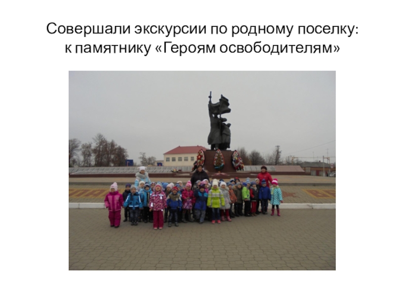 Побывали на памятнике «Солдатам освободителям», рассмотрели здание администрации нашего поселка, побывали у дома культуры, поиграли на главной площади поселка, посетили центральный рынок, рассмотрели улицу Ленина и памятник В.И.Ленину, увидели здание почты России, Сбербанка, школы № 1, играли на стадионе