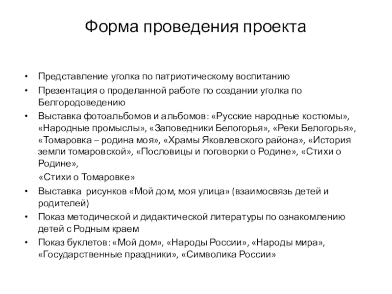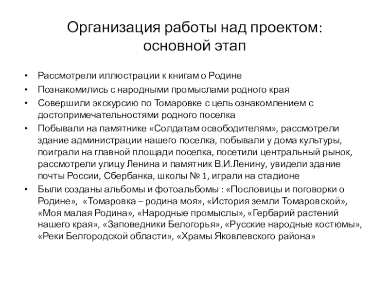 Были созданы альбомы и фотоальбомы : «Пословицы и поговорки о Родине», «Томаровка – родина моя», «История земли Томаровской», «Моя малая Родина», «Народные промыслы», «Гербарий растений нашего края», «Заповедники Белогорья», «Русские народные костюмы», «Реки Белгородской области», «Храмы Яковлевского района»