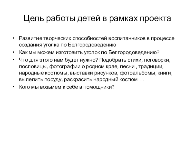 Уточнить какую помощь в создании уголка по Белгородоведению могут оказать сами дети, как и чем