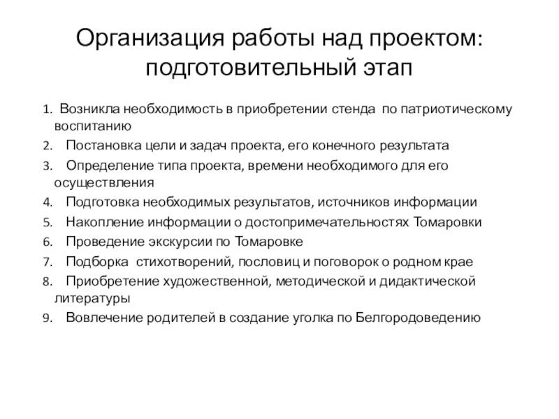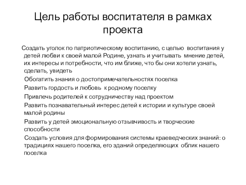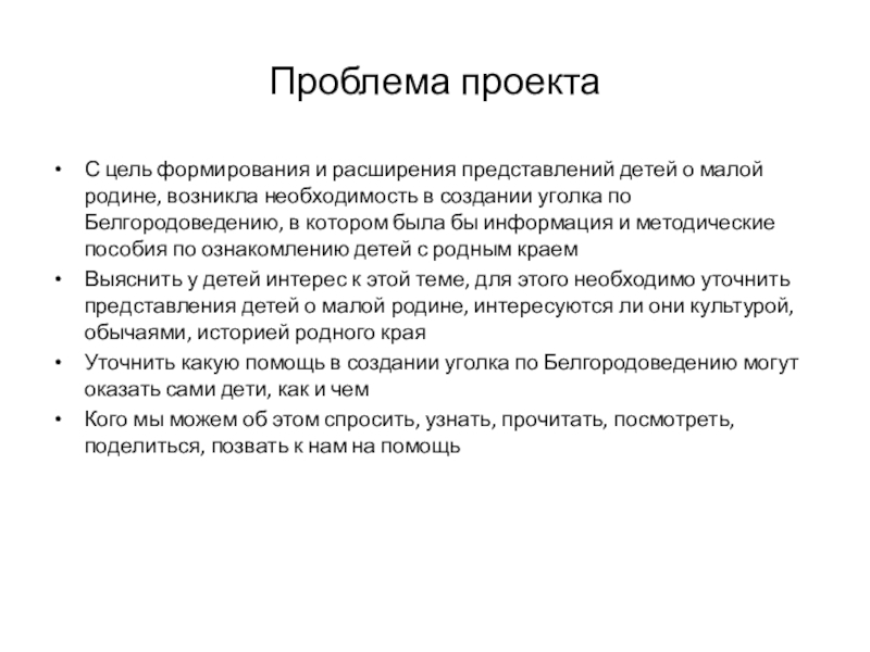 Выяснить у детей интерес к этой теме, для этого необходимо уточнить представления детей о малой родине, интересуются ли они культурой, обычаями, историей родного края