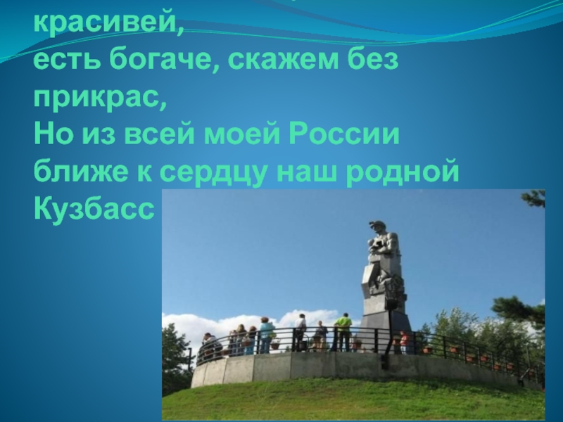 Есть, возможно, уголок красивей, есть богаче, скажем без прикрас, Но из всей моей России ближе к сердцу наш родной Кузбасс !