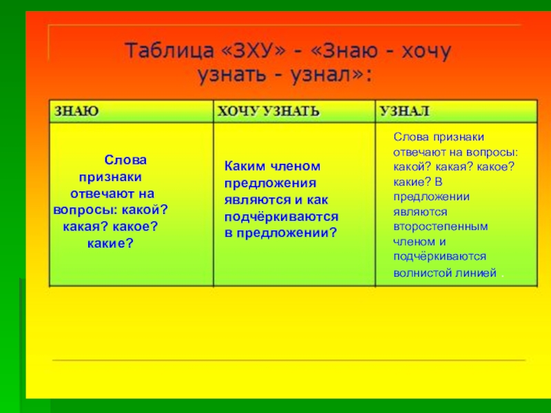 Слова признаки отвечают на вопросы: какой? какая? какое? какие? В предложении являются второстепенным членом и подчёркиваются волнистой линией .