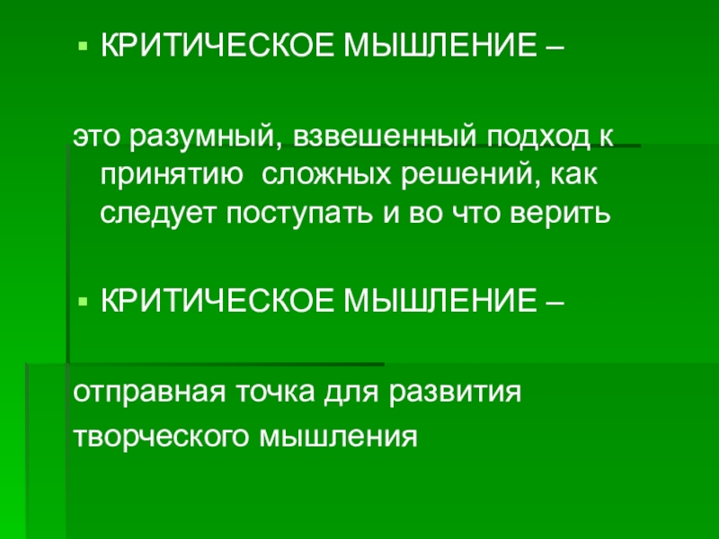 Критическое мышление - это умение занять свою позицию по обсуждаемому вопросу и умение обосновать ее, способность выслушать собеседника, тщательно обдумать аргументы и проанализировать их логику.