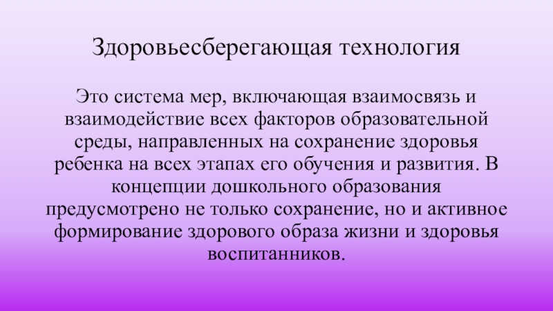 среды, направленных на сохранение здоровья ребенка на всех этапах его обучения и развития. В концепции дошкольного образования предусмотрено не только сохранение, но и активное формирование здорового образа жизни и здоровья воспитанников.