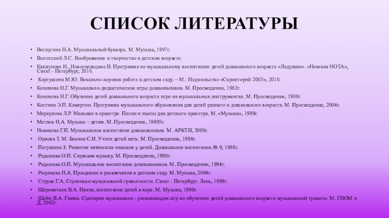 Радынова О.П. Музыкальное воспитание дошкольников. М. Просвещение, 1984г.