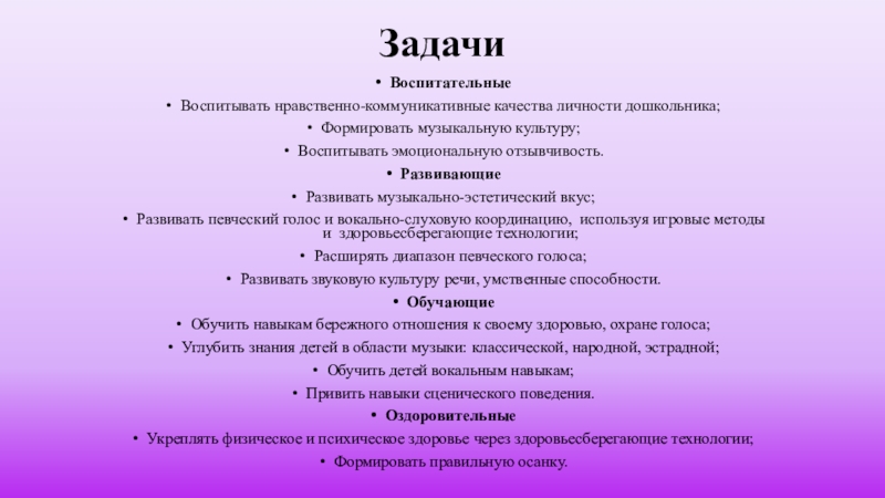 певческий голос и вокально-слуховую координацию, используя игровые методы и здоровьесберегающие технологии;