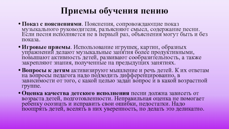 Показ с пояснениями. Пояснения, сопровождающие показ музыкального руководителя, разъясняют