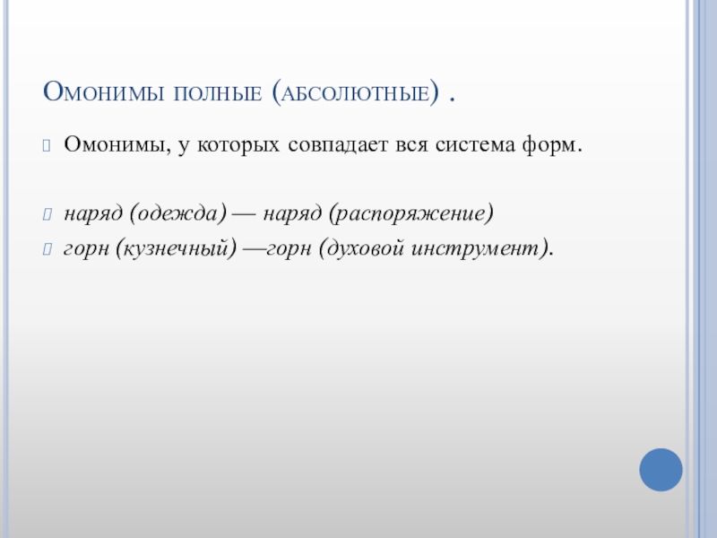 Омонимы полные (абсолютные) .Омонимы, у которых совпадает вся система форм. наряд (одежда) — наряд (распоряжение)горн (кузнечный) —горн (духовой инструмент).