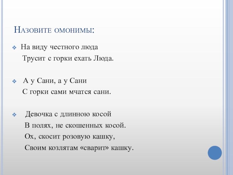 Назовите омонимы:На виду честного люда  Трусит с горки ехать Люда.   А у Сани, а