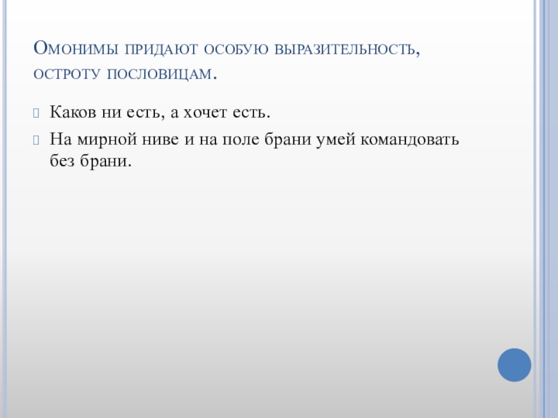 Омонимы придают особую выразительность, остроту пословицам.Каков ни есть, а хочет есть.На мирной ниве и на поле брани