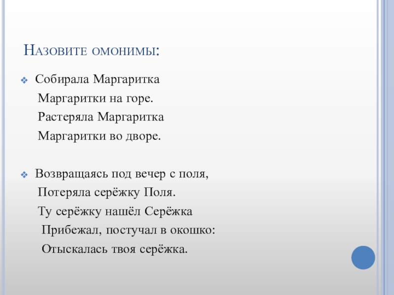 Назовите омонимы:Собирала Маргаритка  Маргаритки на горе.  Растеряла Маргаритка  Маргаритки во дворе.Возвращаясь под вечер с