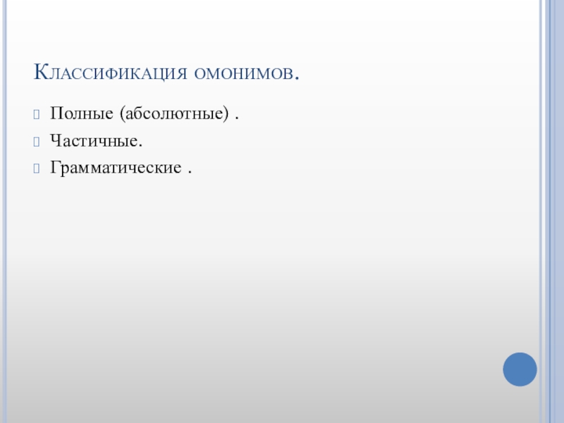 Классификация омонимов.Полные (абсолютные) . Частичные. Грамматические .