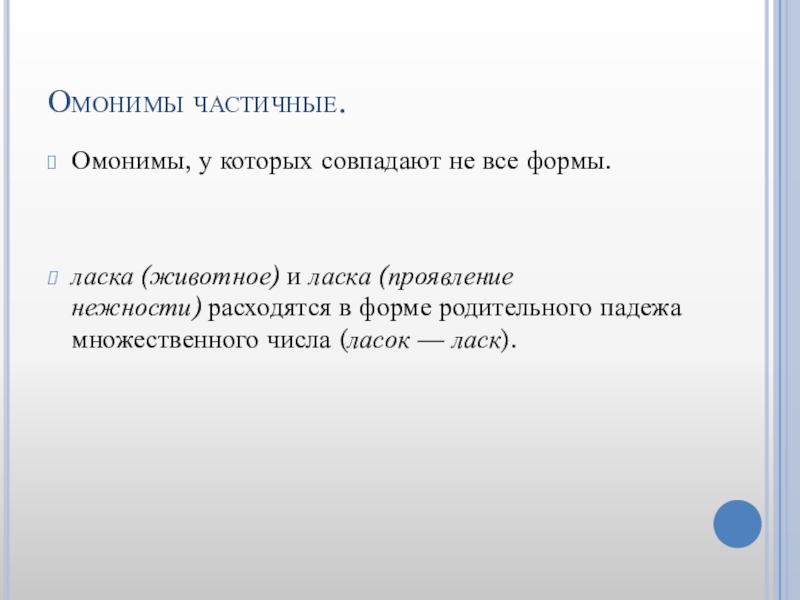 Омонимы частичные.Омонимы, у которых совпадают не все формы. ласка (животное) и ласка (проявление нежности) расходятся в форме родительного падежа множественного