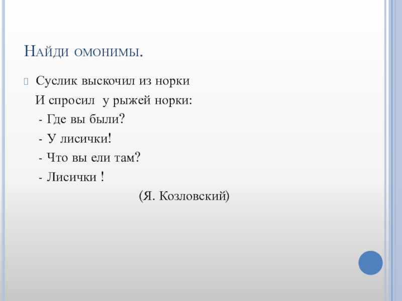 Найди омонимы.Суслик выскочил из норки  И спросил у рыжей норки:  - Где вы были?