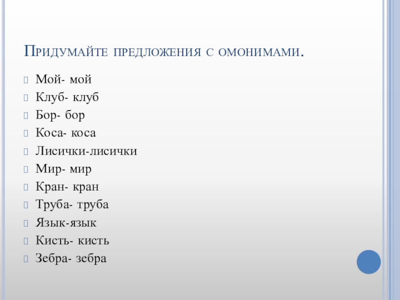 Придумайте предложения с омонимами.Мой- мойКлуб- клубБор- борКоса- косаЛисички-лисичкиМир- мирКран- кранТруба- трубаЯзык-языкКисть- кистьЗебра- зебра