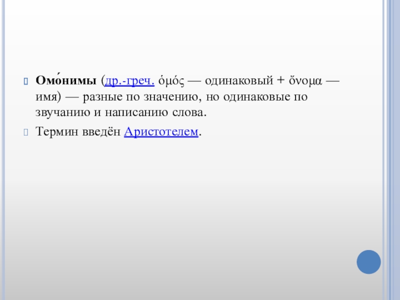 Слайд 2Омо́нимы (др.-греч. ὁμός — одинаковый + ὄνομα — имя) — разные по значению, но одинаковые по звучанию