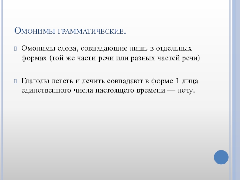 Омонимы грамматические.Омонимы слова, совпадающие лишь в отдельных формах (той же части речи или разных частей речи)Глаголы лететь