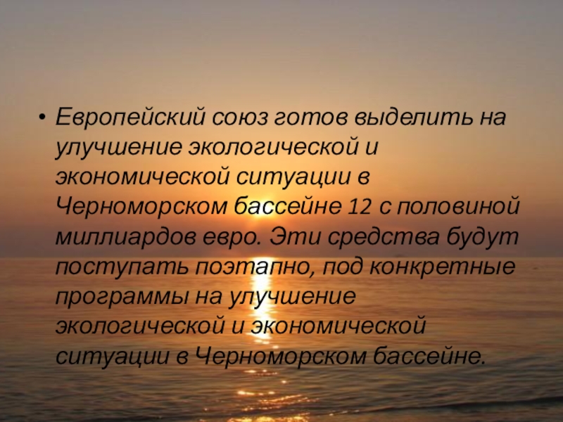 Черноморском бассейне 12 с половиной миллиардов евро. Эти средства будут поступать поэтапно, под конкретные программы на улучшение экологической и экономической ситуации в Черноморском бассейне.
