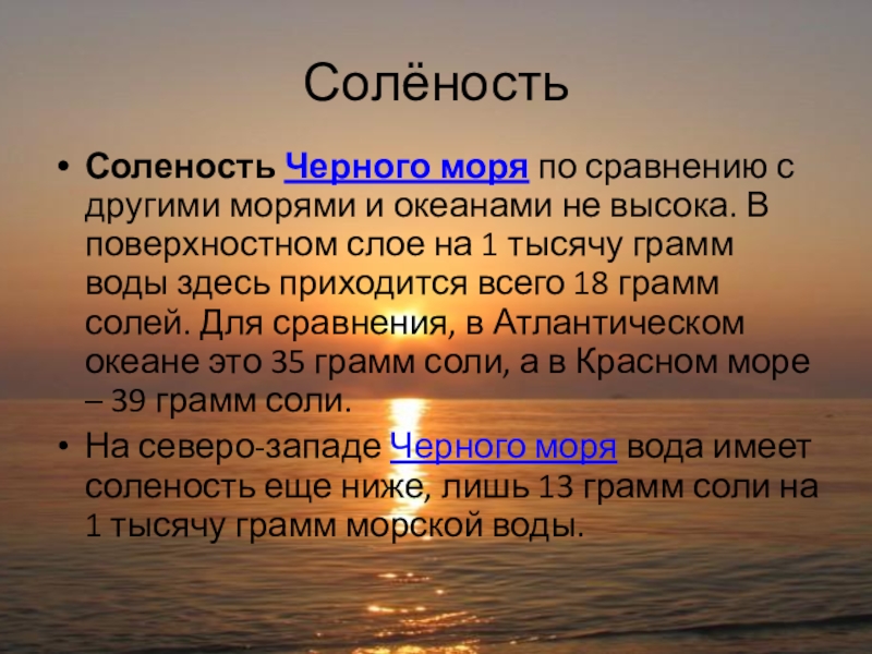 СолёностьСоленость Черного моря по сравнению с другими морями и океанами не высока. В поверхностном слое на 1 тысячу грамм