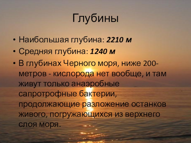 ГлубиныНаибольшая глубина: 2210 мСредняя глубина: 1240 мВ глубинах Черного моря, ниже 200-метров - кислорода нет вообще, и там