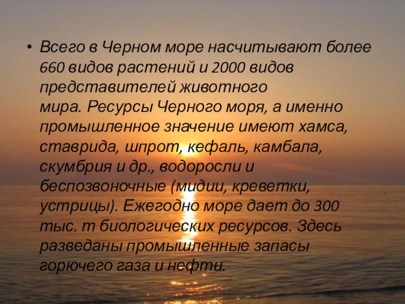 животного мира. Ресурсы Черного моря, а именно промышленное значение имеют хамса, ставрида, шпрот, кефаль, камбала, скумбрия и др., водоросли и беспозвоночные (мидии, креветки, устрицы). Ежегодно море дает до 300 тыс. т биологических ресурсов. Здесь разведаны промышленные запасы горючего газа и нефти.