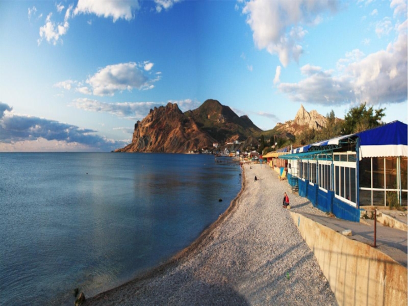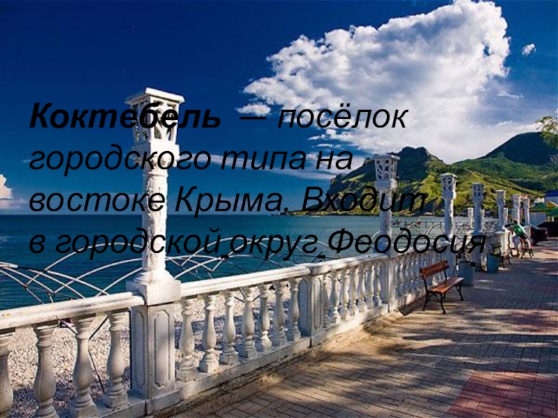 Слайд 14Коктебель — посёлок городского типа на востоке Крыма. Входит в городской округ Феодосия