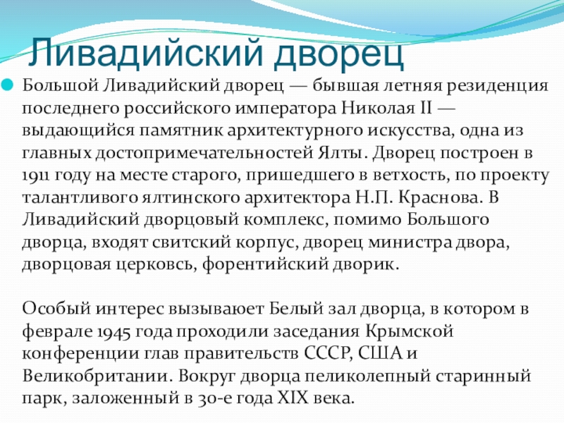 Николая II — выдающийся памятник архитектурного искусства, одна из главных достопримечательностей Ялты. Дворец построен в 1911 году на месте старого, пришедшего в ветхость, по проекту талантливого ялтинского архитектора Н.П. Краснова. В Ливадийский дворцовый комплекс, помимо Большого дворца, входят свитский корпус, дворец министра двора, дворцовая церковсь, форентийский дворик.