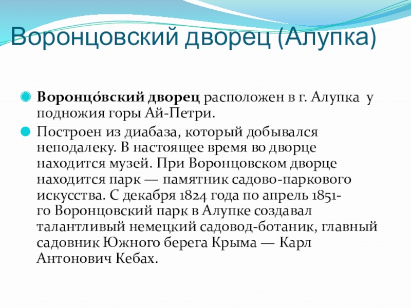 добывался неподалеку. В настоящее время во дворце находится музей. При Воронцовском дворце находится парк — памятник садово-паркового искусства. С декабря 1824 года по апрель 1851-го Воронцовский парк в Алупке создавал талантливый немецкий садовод-ботаник, главный садовник Южного берега Крыма — Карл Антонович Кебах.