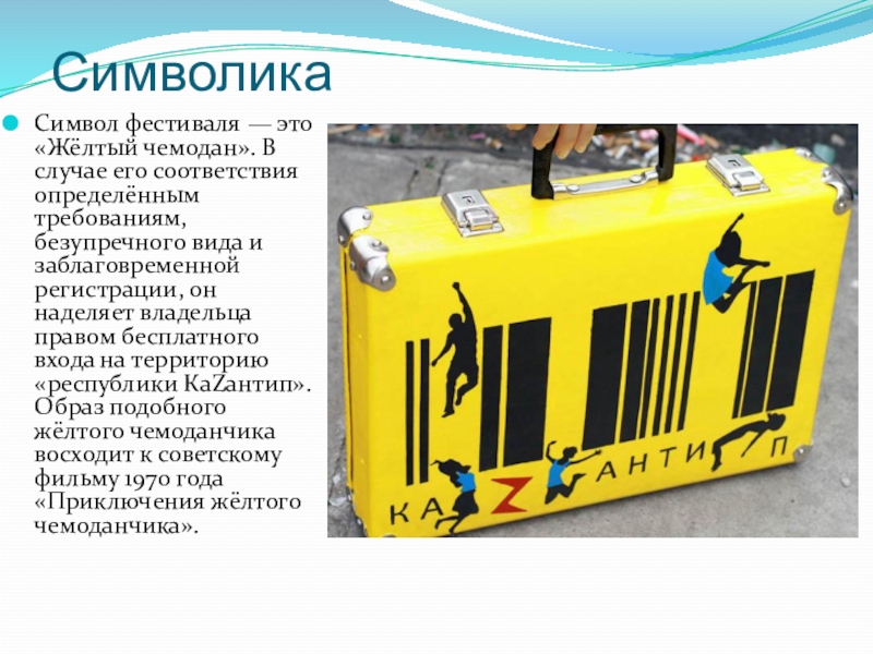безупречного вида и заблаговременной регистрации, он наделяет владельца правом бесплатного входа на территорию «республики КаZантип». Образ подобного жёлтого чемоданчика восходит к советскому фильму 1970 года «Приключения жёлтого чемоданчика».