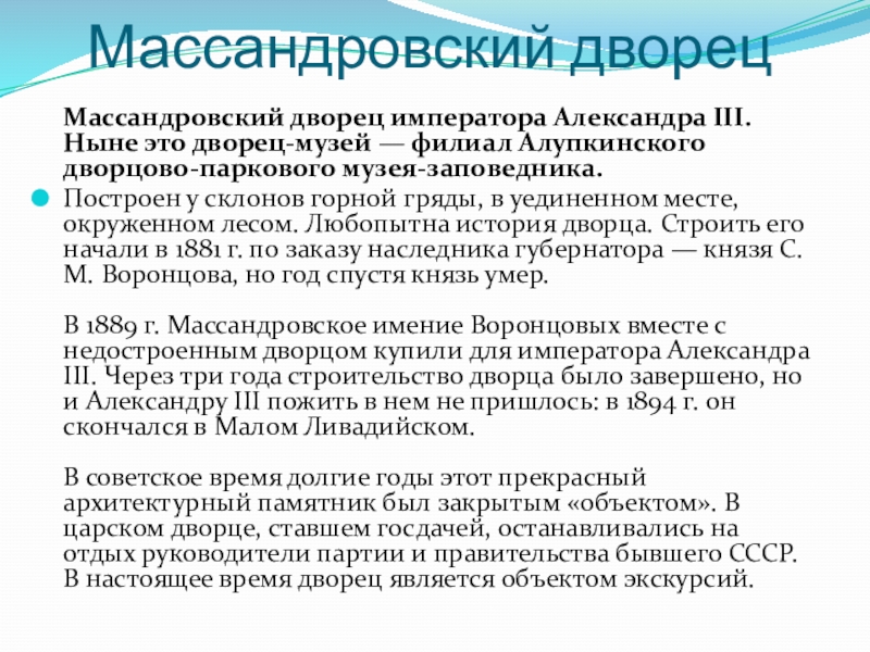 В 1889 г. Массандровское имение Воронцовых вместе с недостроенным дворцом купили для императора Александра III. Через три года строительство дворца было завершено, но и Александру III пожить в нем не пришлось: в 1894 г. он скончался в Малом Ливадийском.