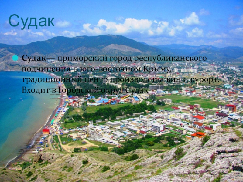 Судак— приморский город республиканского подчинения в юго-восточном Крыму, традиционный центр производства вин и курорт. Входит в Городской