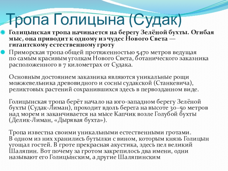 Тропа известна своими уникальными естественными гротами. В одном из них хранились бутылки с вином, которым князь Голицын угощал гостей. В гроте прекрасная акустика, здесь пел великий Шаляпин. Вот почему за гротом закрепилось два имени, одни называют его Голицынским, а другие Шаляпинским