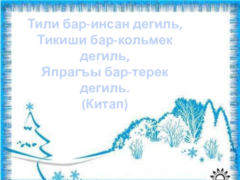 Тили бар-инсан дегиль,Тикиши бар-кольмек дегиль,Япрагъы бар-терек дегиль.(Китап)