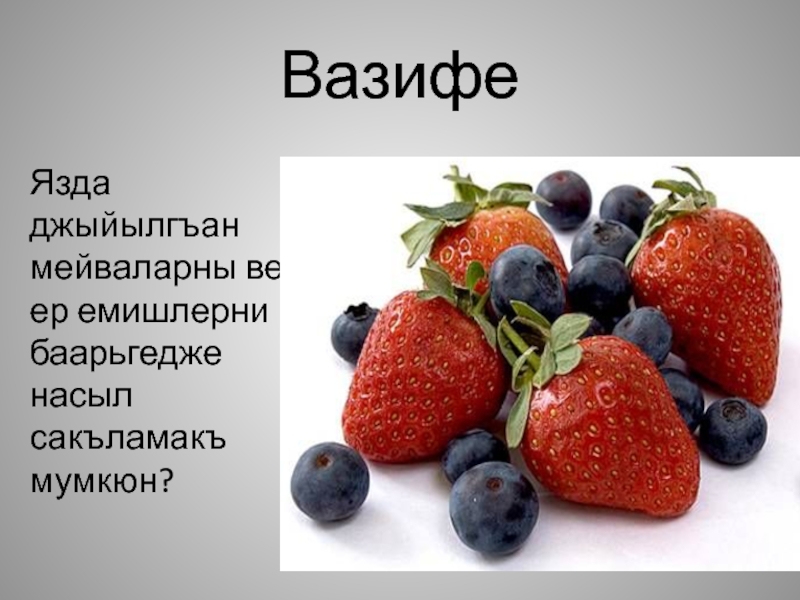 Слайд 1«Себзелер + Мейвалар+ Ер емишлер= Сагълыкъ»