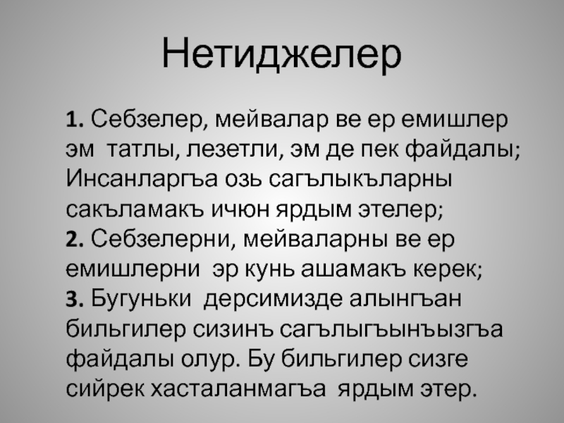 Нетиджелер1. Себзелер, мейвалар ве ер емишлер эм татлы, лезетли, эм де пек файдалы; Инсанларгъа озь сагълыкъларны сакъламакъ