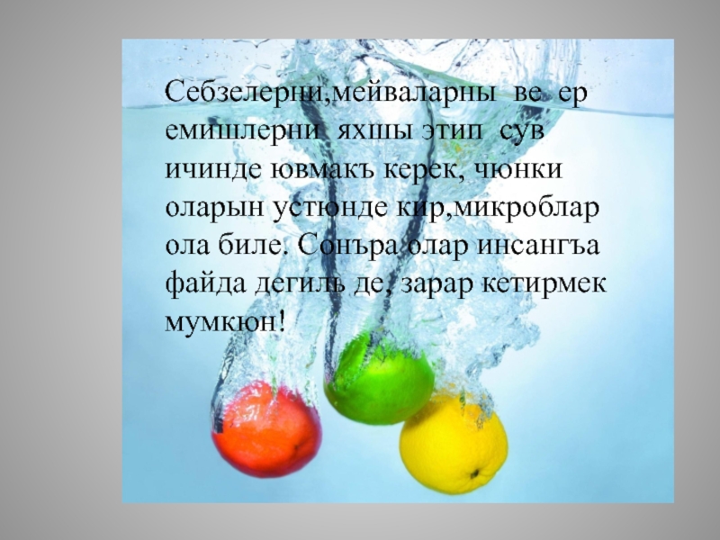 Слайд 30Себзелерни,мейваларны ве ер емишлерни яхшы этип сув ичинде ювмакъ керек, чюнки