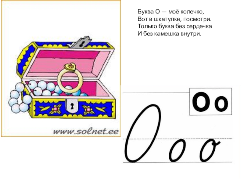Слайд 6Буква О — моё колечко, Вот в шкатулке, посмотри. Только буква без сердечка И