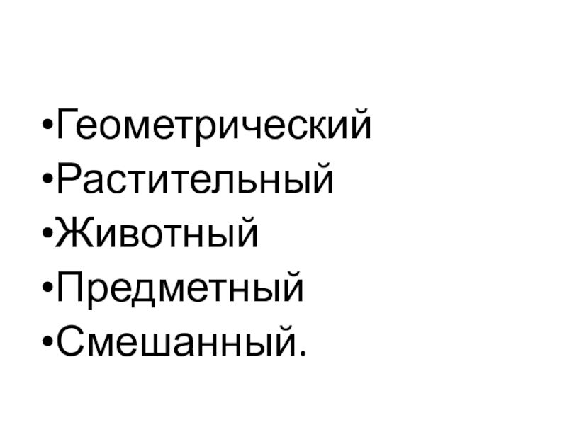ГеометрическийРастительныйЖивотныйПредметныйСмешанный.