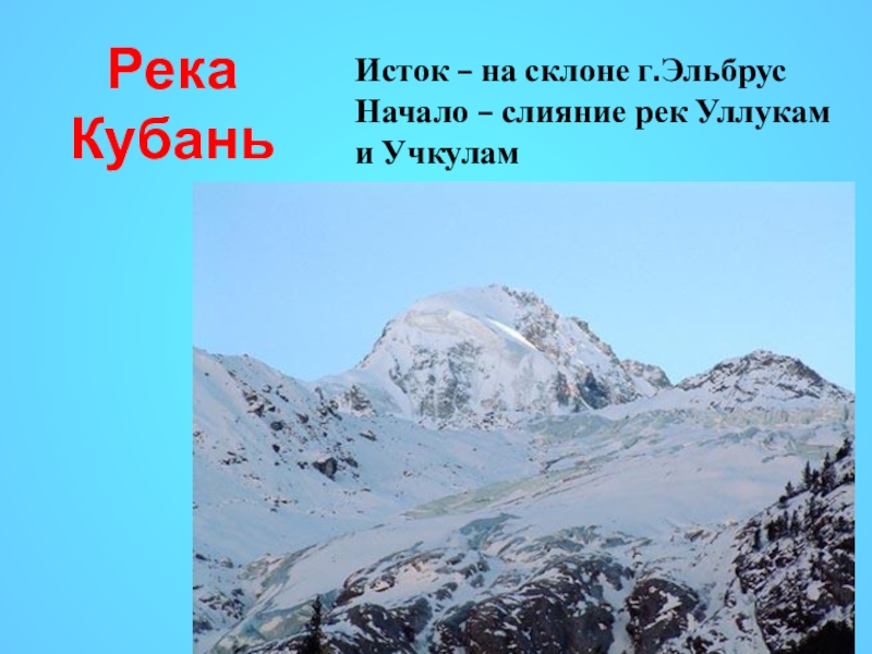 Река  КубаньИсток – на склоне г.ЭльбрусНачало – слияние рек Уллукам и Учкулам