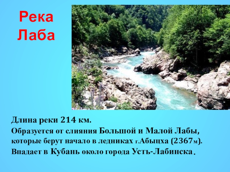 Река  ЛабаДлина реки 214 км.Образуется от слияния Большой и Малой Лабы, которые берут начало в ледниках