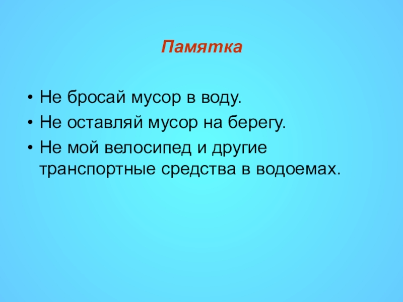 ПамяткаНе бросай мусор в воду.Не оставляй мусор на берегу.Не мой велосипед и другие транспортные средства в водоемах.