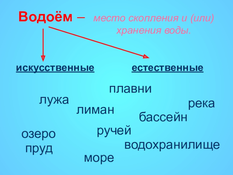 Водоём – искусственныеестественныелужаручейрекапрудводохранилищеплавнилиманморебассейнозероместо скопления и (или) хранения воды.