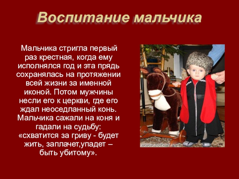 исполнялся год и эта прядь сохранялась на протяжении всей жизни за именной иконой. Потом мужчины несли его к церкви, где его ждал неоседланный конь. Мальчика сажали на коня и гадали на судьбу: «схватится за гриву - будет жить, заплачет,упадет –быть убитому».