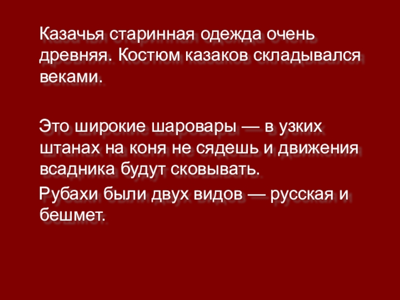 Казачья старинная одежда очень древняя. Костюм казаков складывался веками.