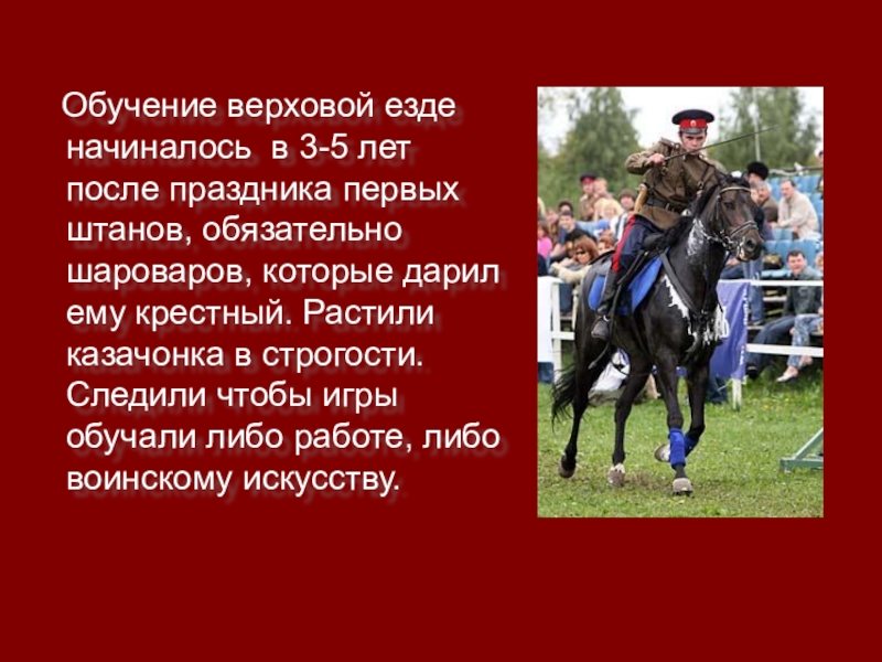 после праздника первых штанов, обязательно шароваров, которые дарил ему крестный. Растили казачонка в строгости. Следили чтобы игры обучали либо работе, либо воинскому искусству.