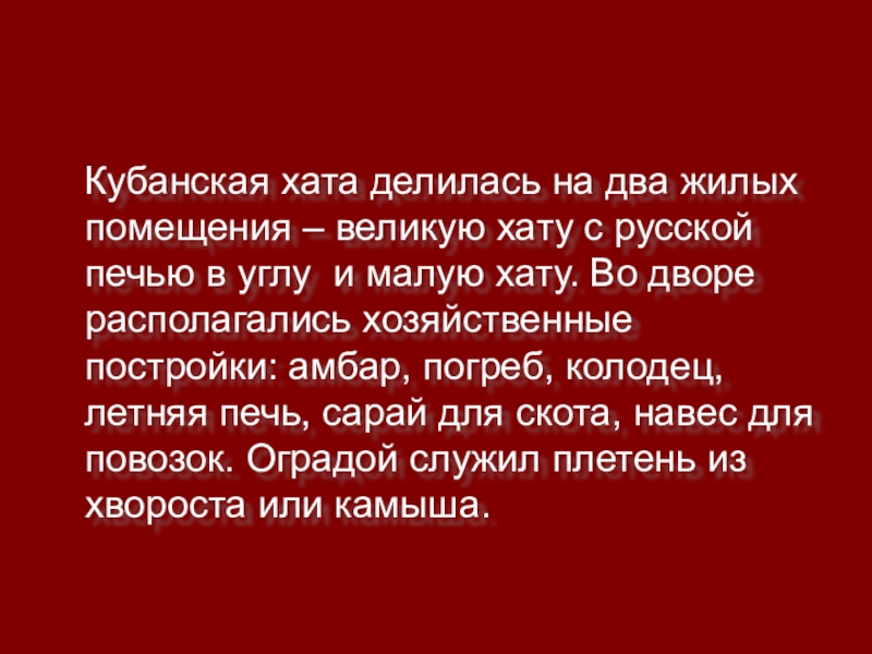 хату с русской печью в углу и малую хату. Во дворе располагались хозяйственные постройки: амбар, погреб, колодец, летняя печь, сарай для скота, навес для повозок. Оградой служил плетень из хвороста или камыша.
