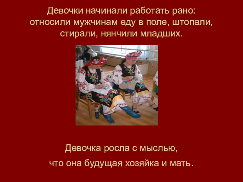 относили мужчинам еду в поле, штопали, стирали, нянчили