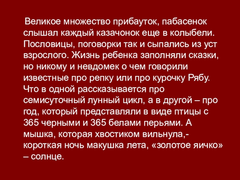 колыбели. Пословицы, поговорки так и сыпались из уст взрослого. Жизнь ребенка заполняли сказки, но никому и невдомек о чем говорили известные про репку или про курочку Рябу. Что в одной рассказывается про семисуточный лунный цикл, а в другой – про год, который представляли в виде птицы с 365 черными и 365 белами перьями. А мышка, которая хвостиком вильнула,- короткая ночь макушка лета, «золотое яичко» – солнце.